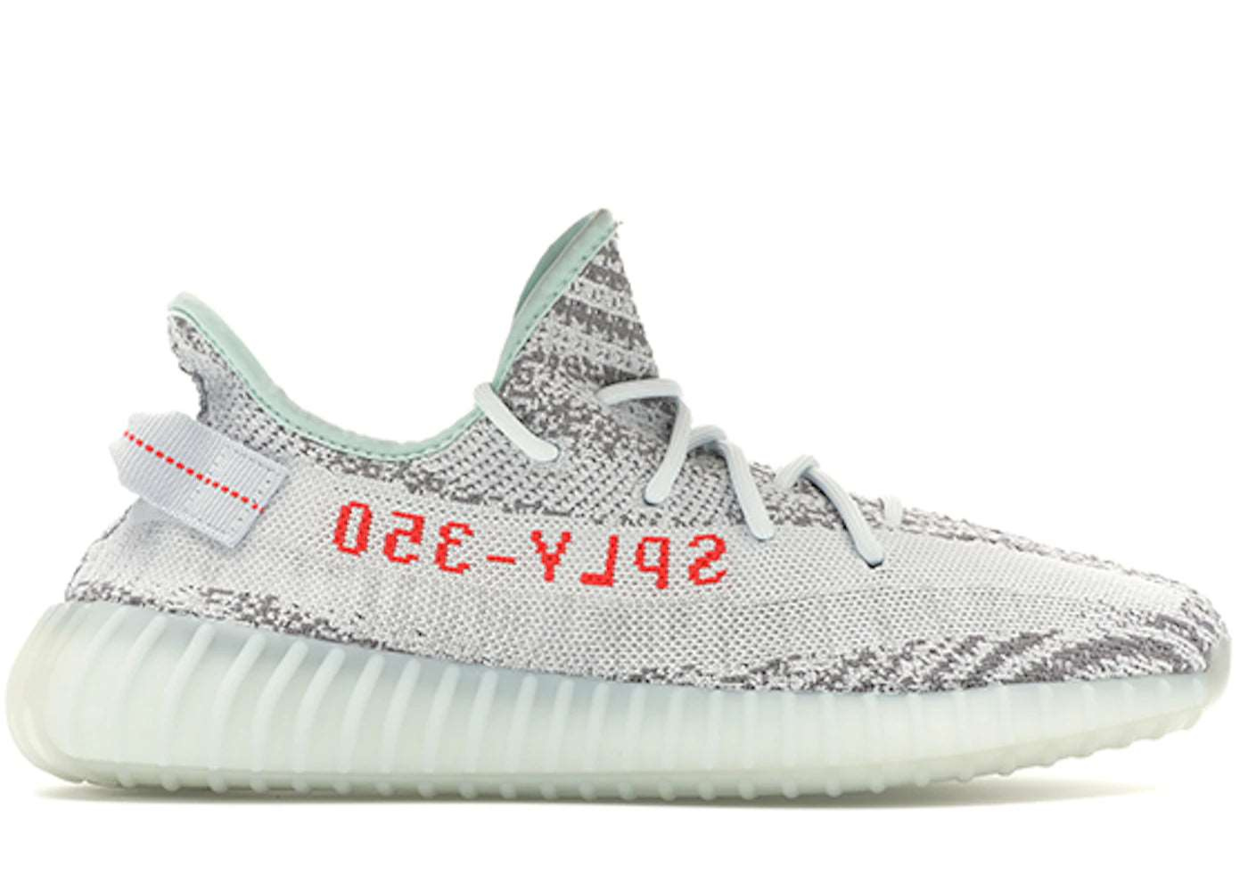 The adidas Yeezy Boost 350 V2 Blue Tint is designed in a pattern reminiscent of the popular adidas Yeezy Boost 350 V2 Zebra. It has a marbled grey Primeknit upper with a light grey side stripe that is accented with bright red SPLY-350 text. A Blue Tint semi-translucent Boost sole at the base provides support and cushioning.